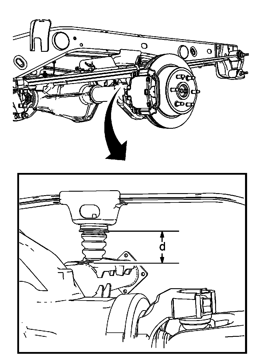 4. For the 1500 series Sierra/Denali/Silverado pick up trucks, measure the (D) height from the jounce bumper cup to the rear axle pad. Refer to Trim Height Specifications Trim Height Specifications.