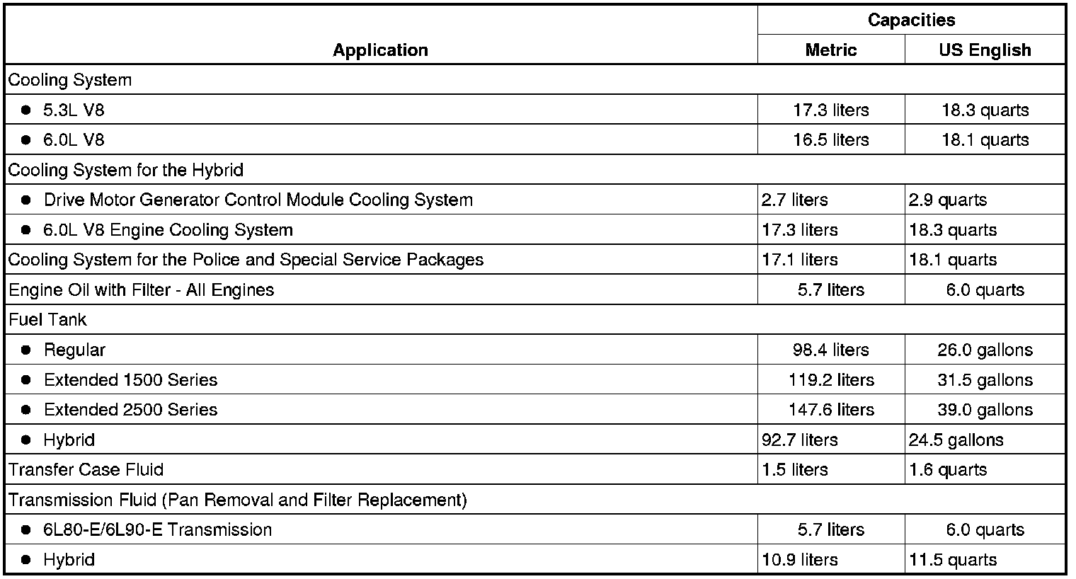 See Fluid and Lubricant Recommendations Maintenance for more information. All capacities are approximate. When adding, be sure to fill to the approximate level, as recommended in this manual. Recheck fluid level after filling.