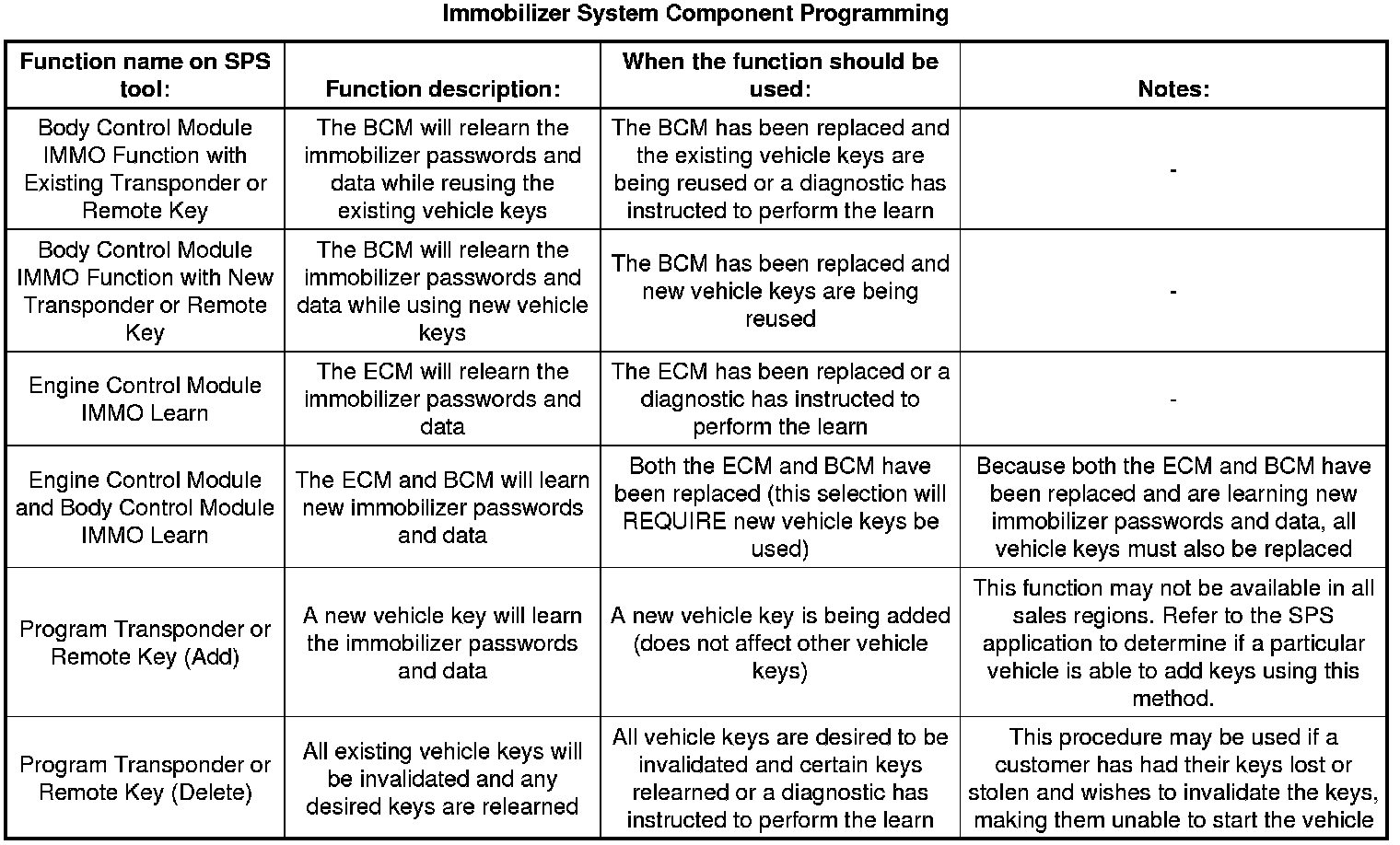 Depending on the immobilizer function being learned or the component replaced, different learn functions are required to be performed. These learn functions are as follows:
