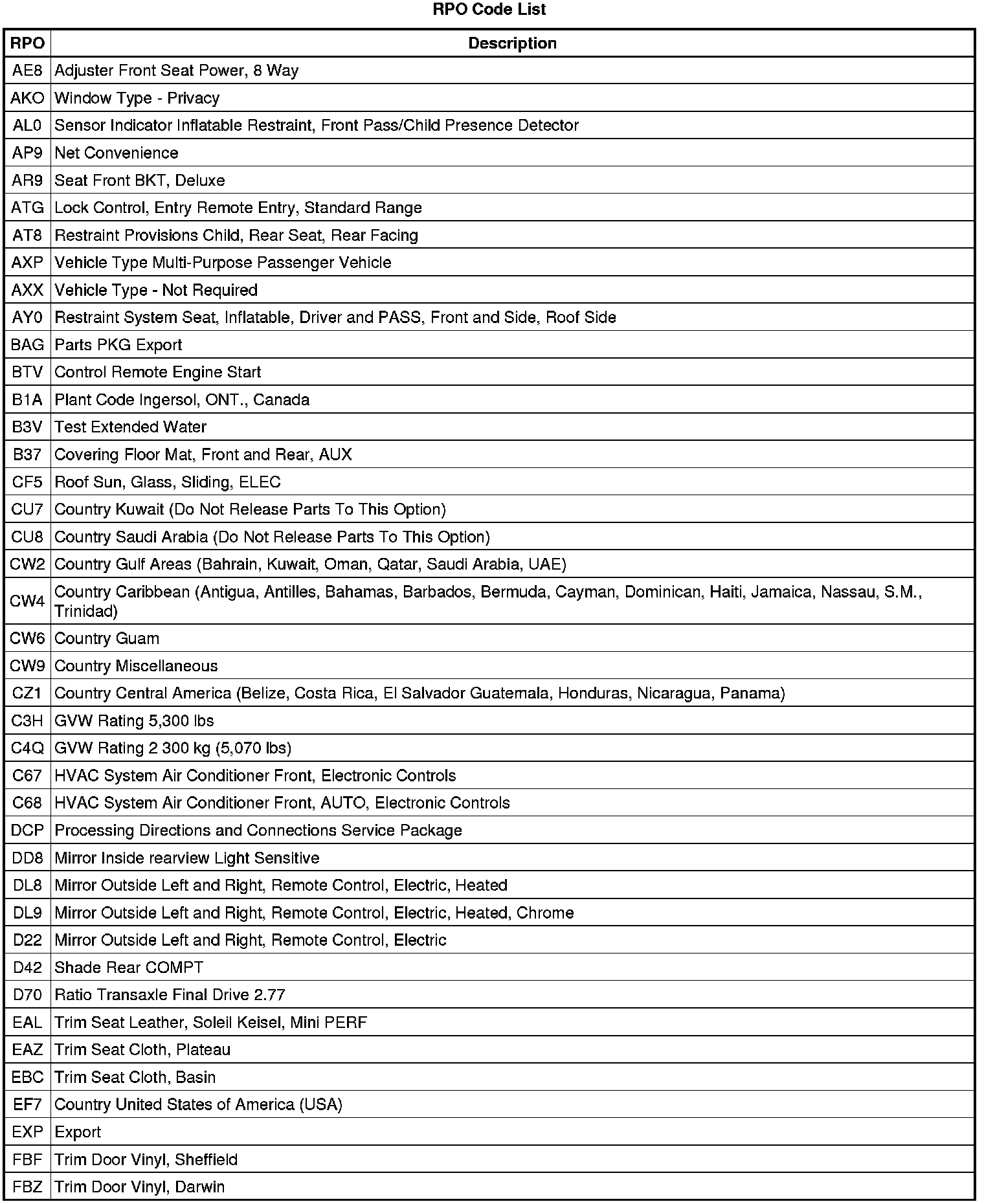 The following table provides the description of the RPO codes that are available on the vehicle. The vehicles RPO list is printed on the Service Parts Identification Label.