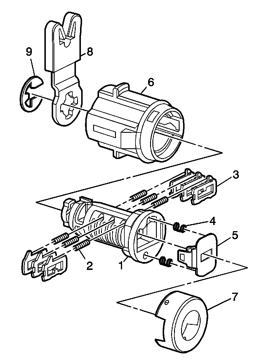 3. Hold the cylinder (1) so the spring pockets faces up (spring pocket nearest to the back of the key head).