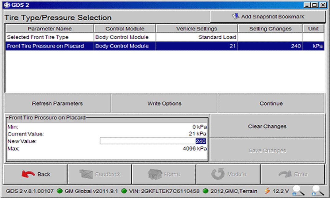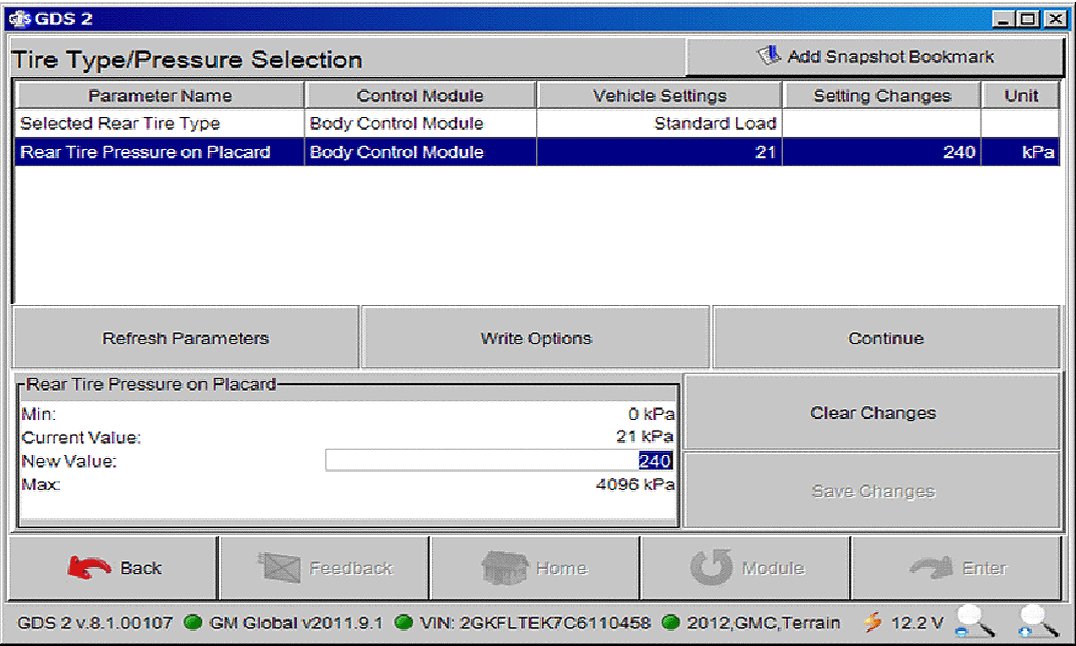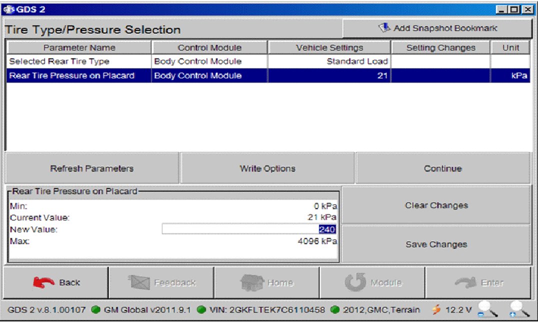 2. Enter tire type and placard values into the body control module (BCM) using GDS2.