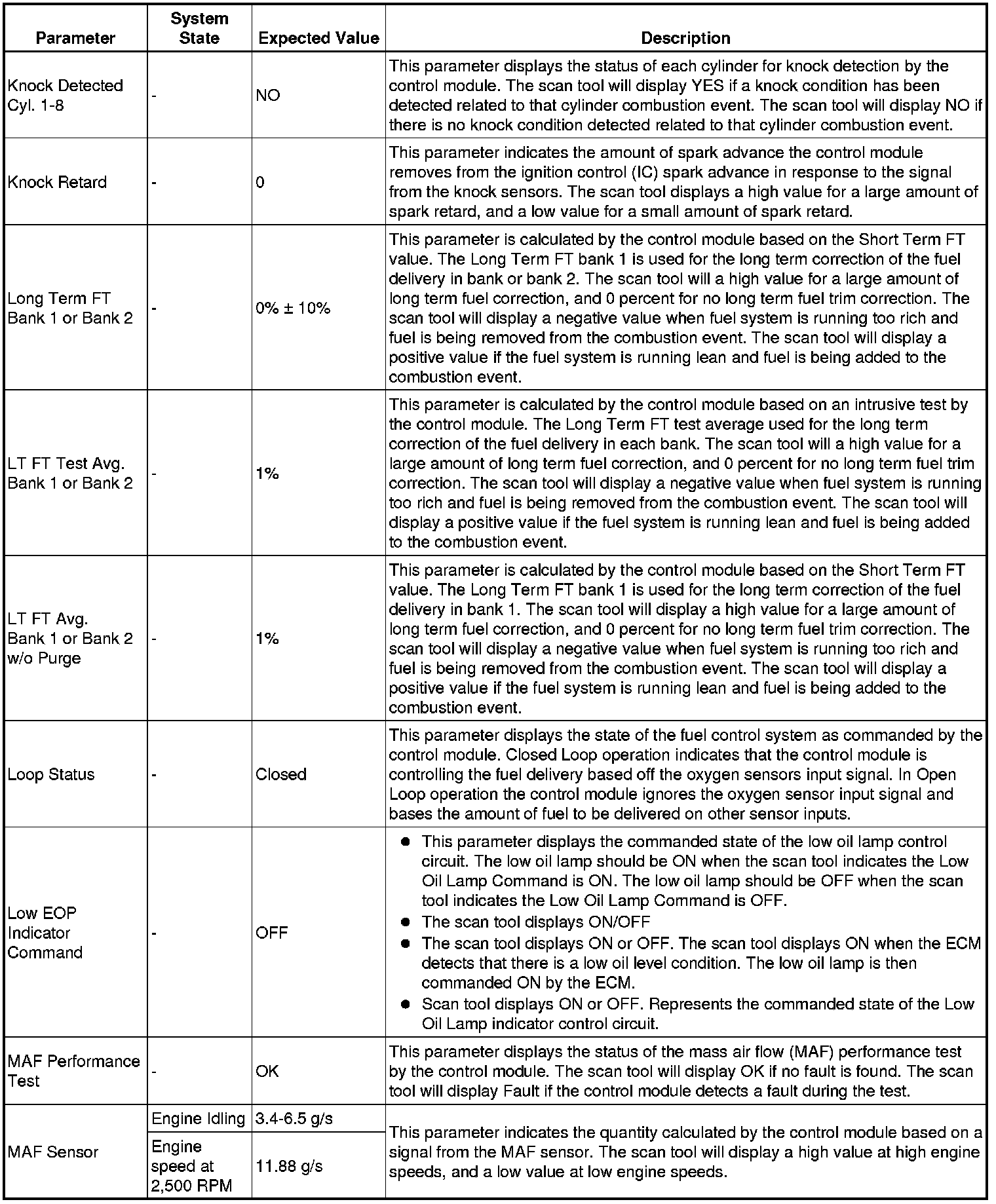 The scan tool values from a properly running engine may be used for comparison with the engine you are diagnosing. The engine scan tool data list represents values that would be seen on a normally running engine.