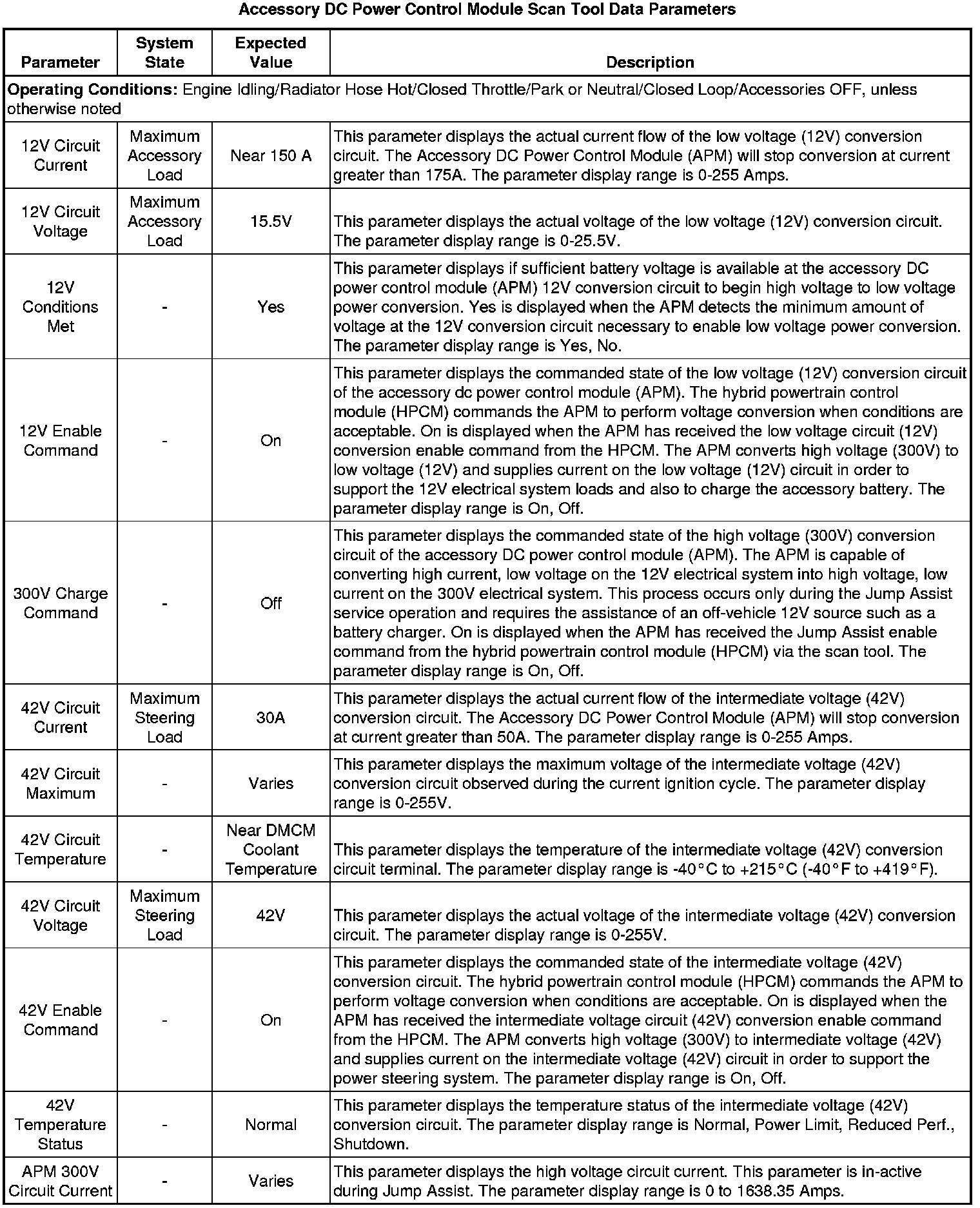 The scan tool values from a properly running vehicle may be used for comparison with the vehicle you are diagnosing. The Accessory DC Power Control Module Scan Tool Data Parameters list represents values that would be seen on a normally running vehicle.