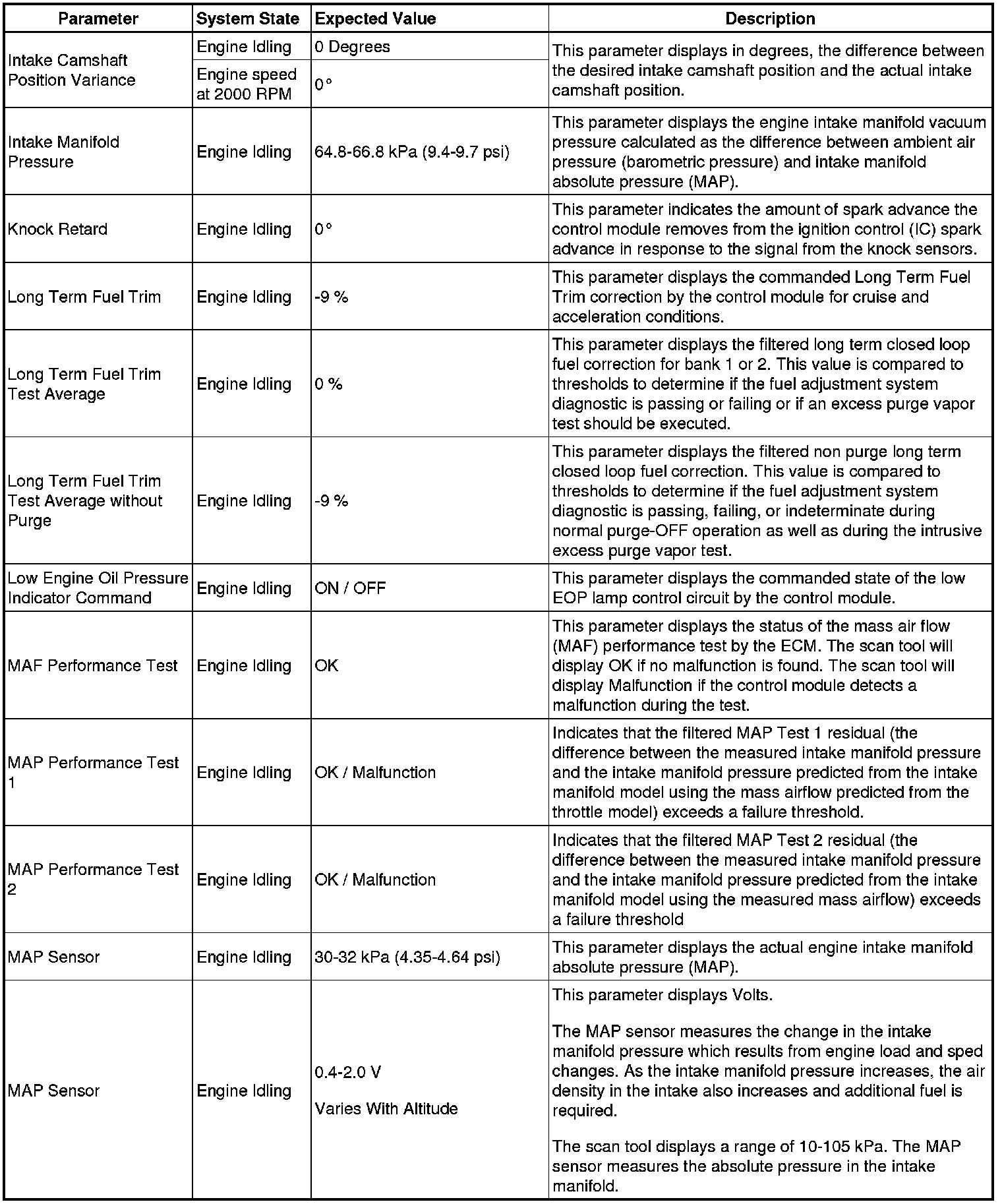 The scan tool values from a properly running engine may be used for comparison with the engine you are diagnosing. The Engine Scan Tool Data List represents values that would be seen on a normally running engine.