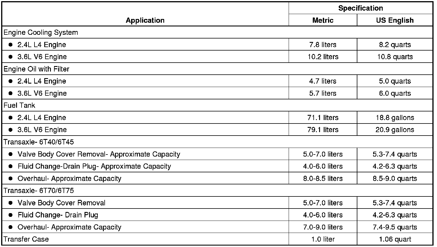 The following approximate capacities are given in US English and metric conversions. See Fluid and Lubricant Recommendations Maintenance for more information. All capacities are approximate. When adding, be sure to fill to the approximate level, as recommended in this manual. Recheck fluid level after filling.