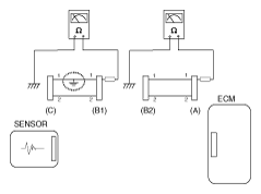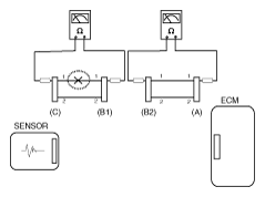 If the measured resistance between connector (C) and (B1) is 1M Ω or higher, and the resistance between (B2) and (A) is 1 Ω or lower, line 1 of connector (C) and line 1 of connector (B1) are open circuits.