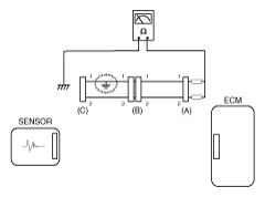 - With each connector still connected, measure the voltage between the chassis ground and terminal 1 of each connectors (A), (B) and (C) as shown in [Fig 4].