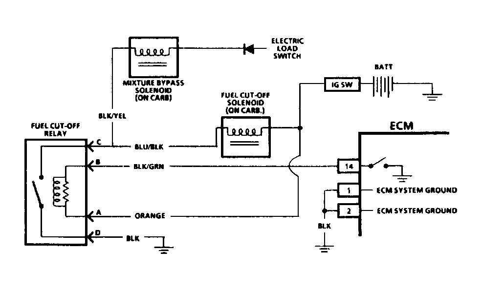 - Open throttle slightly and keep engine at 3500 RPM. Note voltage. If voltage is less than 6 volts, go to step 3). If voltage is greater than 6 volts, check for open between terminal "B" and ECM terminal No. 14. If circuit is not open, adjust idle switch. If adjustment is okay, ECM or connection is bad.