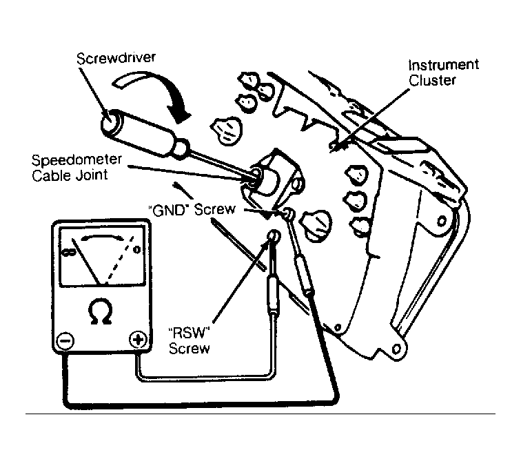 Disconnect battery. Remove instrument cluster. Connect ohmmeter between "GND" screw and "RSW" screw of combination meter. See Fig 1 . Turn cable joint of speedometer with a screwdriver. Ohmmeter should vary between infinite and zero ohms of resistance 4 times for every one revolution of speedometer cable joint.