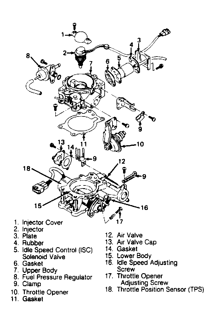 - Remove throttle position sensor, fuel pressure regulator and idle speed control solenoid valve from throttle body. See Fig 1 . Remove attaching screws and separate upper and lower bodies.