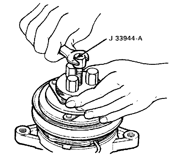 2. Using Puller (J 33944-A), remove the drive plate. Remove the shims from the compressor drive shaft or drive plate.