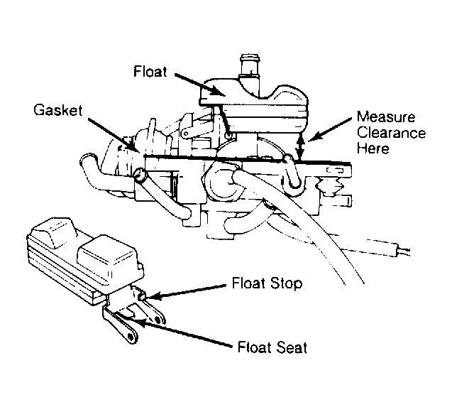 - Remove air horn from carburetor. Invert air horn and allow float to hang by its own weight. Measure clearance between top of float and gasket. See Fig 1 .