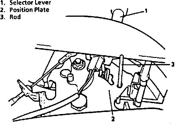 Remove center console box, shift selector lever to "N" range and insert 4 mm (0.16 in.) diameter rod into holes in selector lever position plate and selector lever so that selector lever is held in "N" range position. Then connect cable to lever.