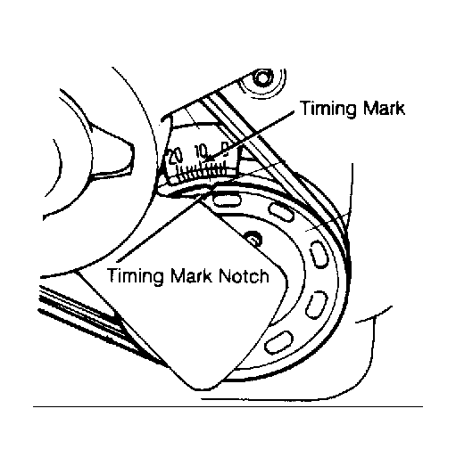- Inspect timing indicator mark and crankshaft pulley notch. Clean marks if necessary. See Figure
