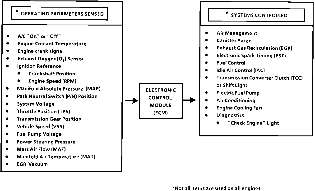 The computer command control system, which is controlled by the Electronic Control Module (ECM), is designed to maintain exhaust emission levels at federal standards while providing good driveability and fuel efficiency. The functions of the system are based on data gathered by sensors and switches located throughout the vehicle. The ECM maintains control over fuel delivery, ignition, idle air flow, the fuel pump and other system components, while monitoring the system for faulty operation with its diagnostic capabilities.