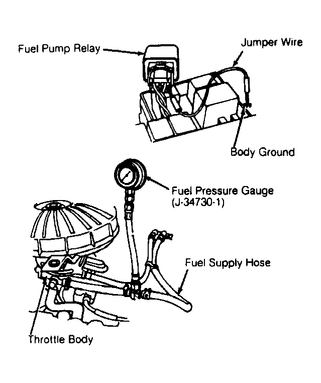 - Relieve fuel system pressure. See FUEL PRESSURE RELEASE. Remove air cleaner assembly. Remove fuel inlet hose from throttle body and install Fuel Pressure Gauge (J-34730-1) with "T" Fitting Adapter (J-34730-75). See Fig 1