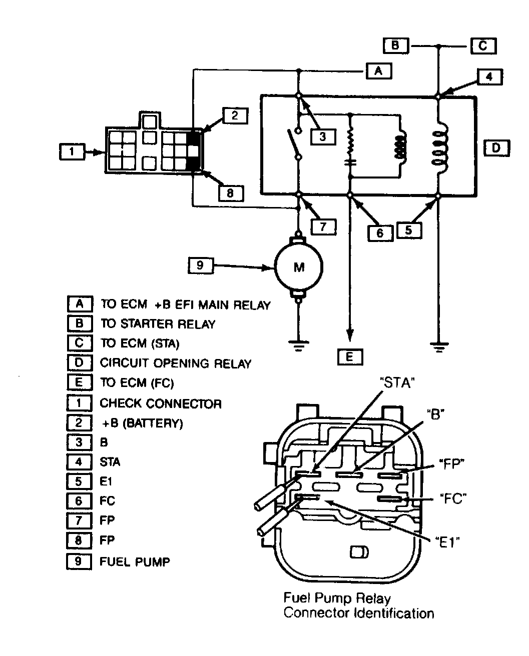- Attach battery voltage to terminal "STA" terminal and ground terminal "E1". Ensure continuity is present between terminals "B" and "FP". Apply battery voltage to terminal "B" and ground terminal "FC". Ensure continuity is present between terminals "B" and "FP". Replace relay if not as specified.
