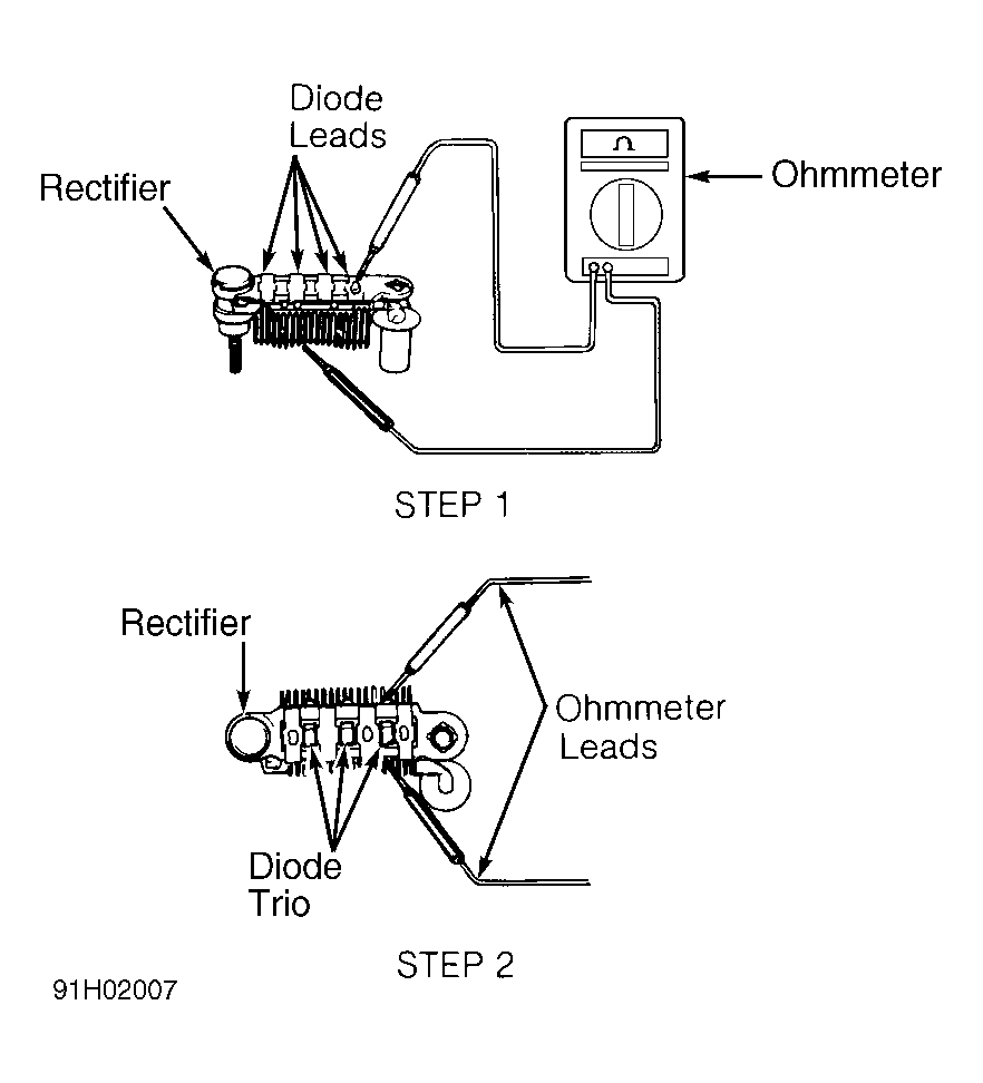 - Using an ohmmeter, check for continuity between each upper and lower rectifier bodies and each diode leads. Perform STEP 1. See Fig 1. Check for continuity in both directions by reversing ohmmeter leads. Continuity should only exist in one direction. If continuity exists in both directions or neither direction, replace rectifier.