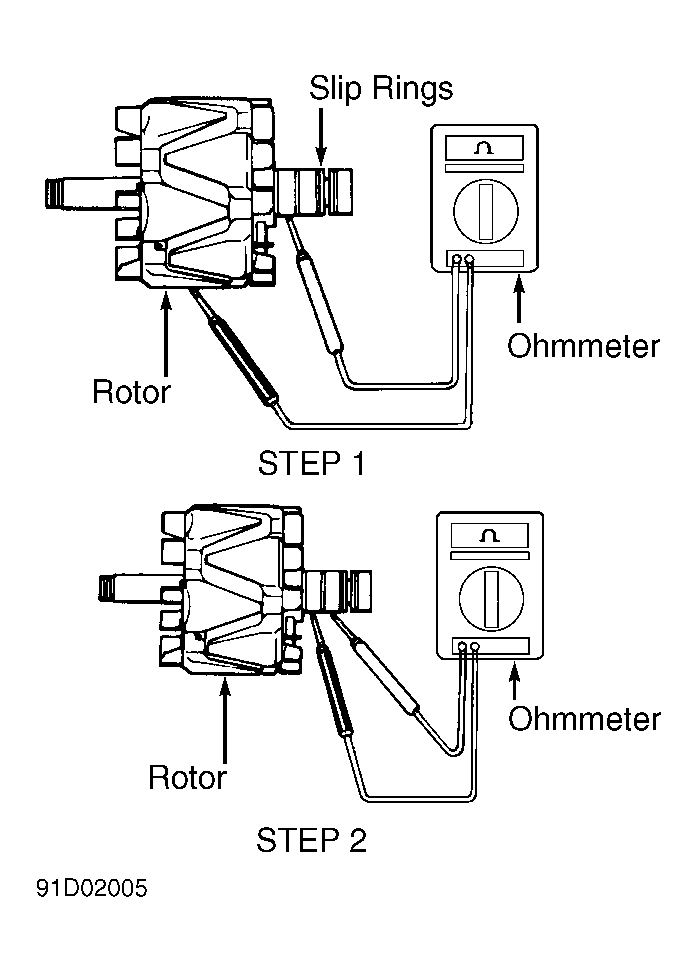- Using an ohmmeter, check for continuity between rotor and slip rings. Perform STEP 1. See Fig 1. If continuity exists, replace rotor.