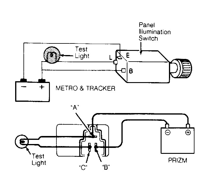 To check panel illumination switch, remove switch from dash panel and connect 12-volt battery positive jumper lead to terminal "B" of switch. Connect battery negative jumper lead to terminal "E" of switch. Connect test light between terminal "L" and battery positive terminal. See Fig 1 . Turning switch clockwise should brighten test light; counterclockwise should dim test light.