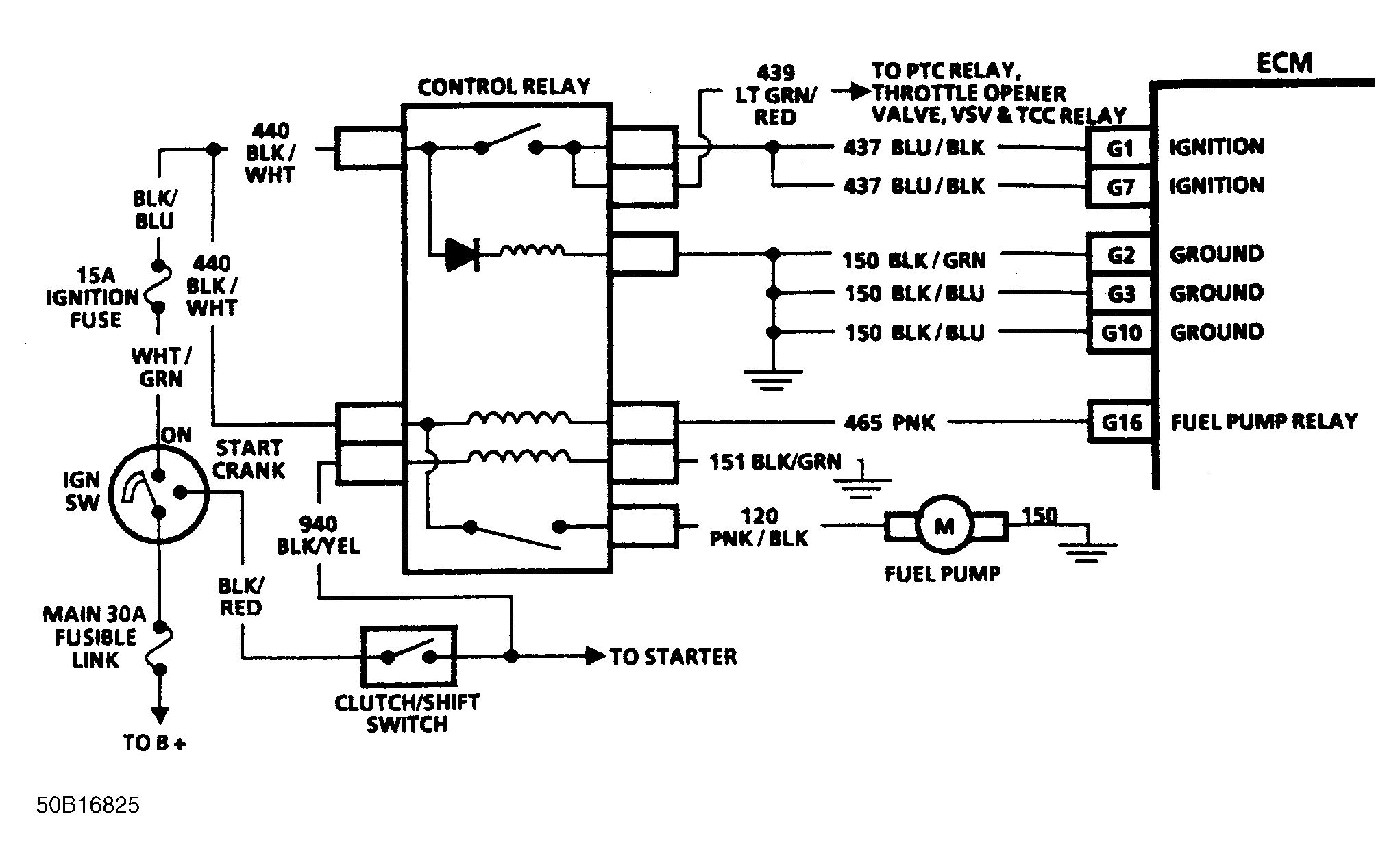 The control relay is involved in many of the circuits that the ECM uses to control the starting of the vehicle. The fuel pump circuit and the starter operation depend on the function of the control relay.
