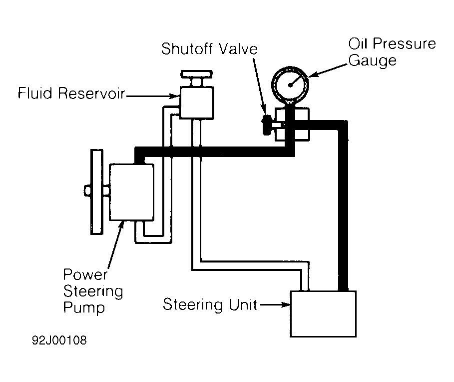 - With steering wheel straight ahead, check pressure gauge. If gauge reads more than 145 psi (10.0 kg/cm2 ), check flow control valve, pressure hoses and pipes for restrictions.