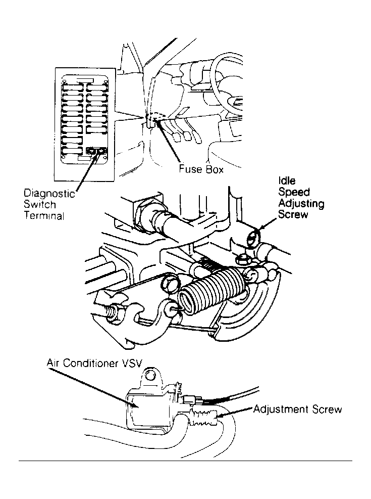 When A/C is operated, ECM operates A/C Vacuum Switching Valve (VSV) to supply by-pass air to increase engine idle speed. A/C VSV is mounted on firewall, to right of ignition coil. See Fig 1 . No other information is available from manufacturer.