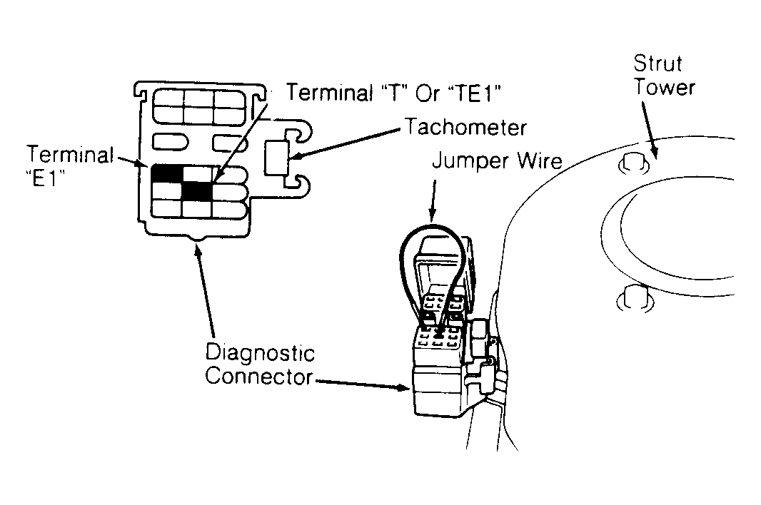 - Turn engine off. Connect timing light to No. 1 spark plug wire. Install jumper wire between terminals "E1" and "TE1" of diagnostic connector. See Fig 1