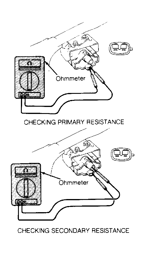 Disconnect electrical connector and high tension coil wire from ignition coil. Using ohmmeter, measure primary and secondary resistance. See Fig 1. Replace ignition coil if readings are not within specification. See IGNITION COIL RESISTANCE table.