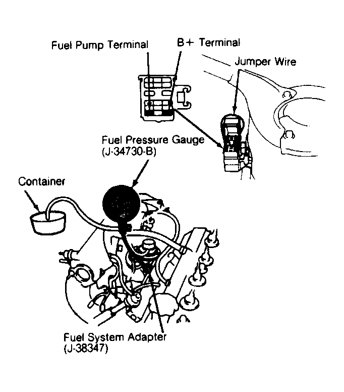 - Install Adapter (J-38347) and 2 new gaskets. See Fig 1. Tighten adapter retaining bolt to 13 ft. lbs. (18 N.m). Install Fuel Pressure Gauge (J-34730-B). Ensure shutoff valve is closed on fuel pressure gauge.