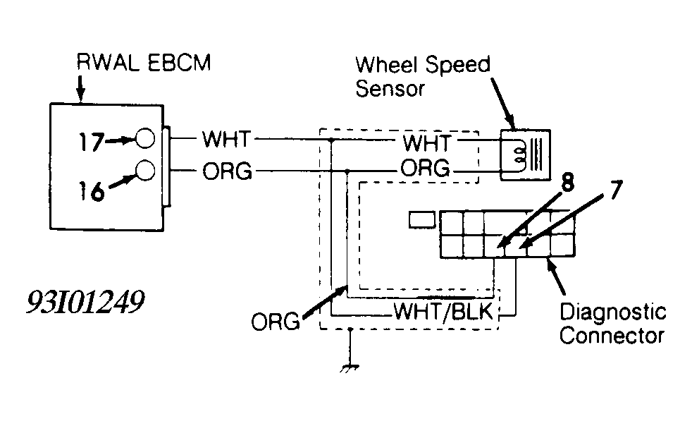 - If resistance is greater than 20,000 ohms, measure resistance between RWAL EBCM terminals No. 16 and 17. If resistance is greater than 20,000 ohms, replace RWAL EBCM. If resistance is less than 20,000 ohms, repair short between Orange and White wires in speed sensor harness.
