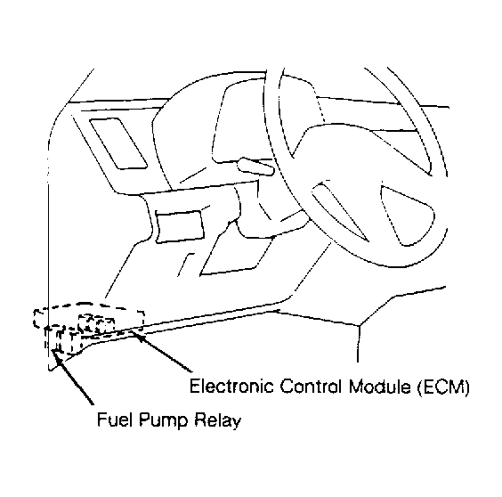 - Loosen fuel tank cap to release fuel tank pressure. Disconnect electrical connector from fuel pump relay. Fuel pump relay is mounted on ECM, located under left side of instrument panel, near kick panel. See Fig 1 .