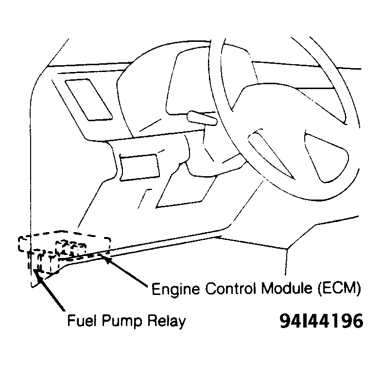 - Loosen fuel tank cap to release fuel tank pressure. Disconnect electrical connector from fuel pump relay. Fuel pump relay is mounted on ECM, located under left side of dash, near kick panel. See Fig 1 .