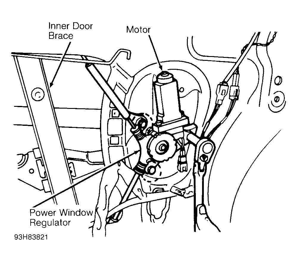 - Remove 4 bolts, one nut and inner door panel brace. Disconnect power window motor connector. Remove 3 motor/regulator mounting bolts and nuts. Remove motor/regulator assembly. See Fig 1 . To install, reverse removal procedure. Tighten motor/regulator assembly bolts and nuts to 62 INCH lbs. (7 N.m). Tighten inner door panel brace to 11 ft. lbs. (15 N.m).