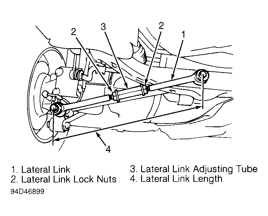 Adjust toe-in by changing lateral link length. Loosen right and left lateral link lock nuts. See Fig 1 . Turn right and left lateral links evenly to set toe-in to specification. See ALIGNMENT SPECIFICATIONS . Tighten lateral link lock nuts to specification. See TORQUE SPECIFICATIONS .