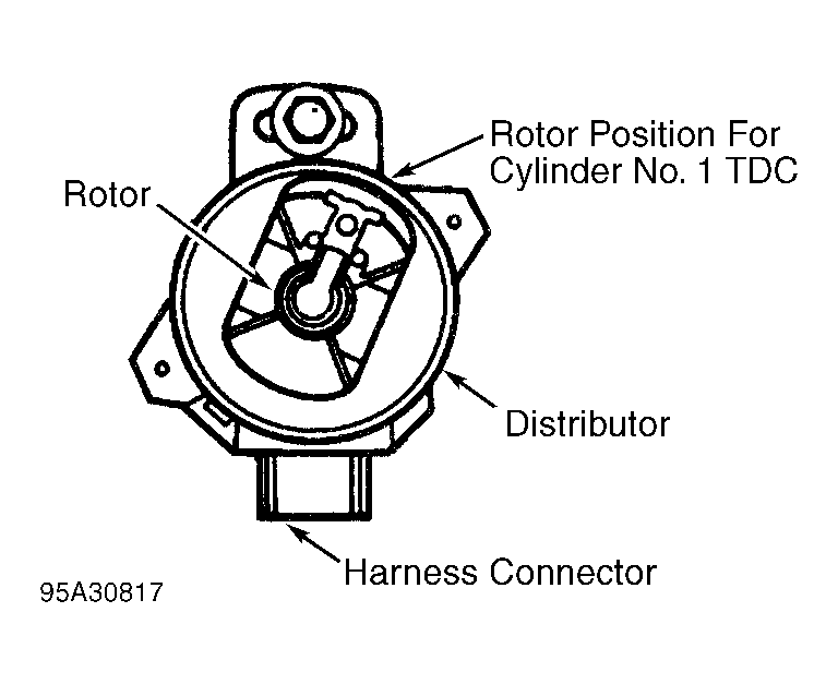 - Disconnect negative battery cable. Remove valve cover and gaskets. Rotate crankshaft until No. 1 cylinder is at TDC of compression stroke. Ensure timing "V" mark on crankshaft pulley aligns with zero mark on timing belt cover. See Fig 1 . Remove distributor cap and ensure rotor is positioned to indicate cylinder No. 1 TDC. See Fig 2 .