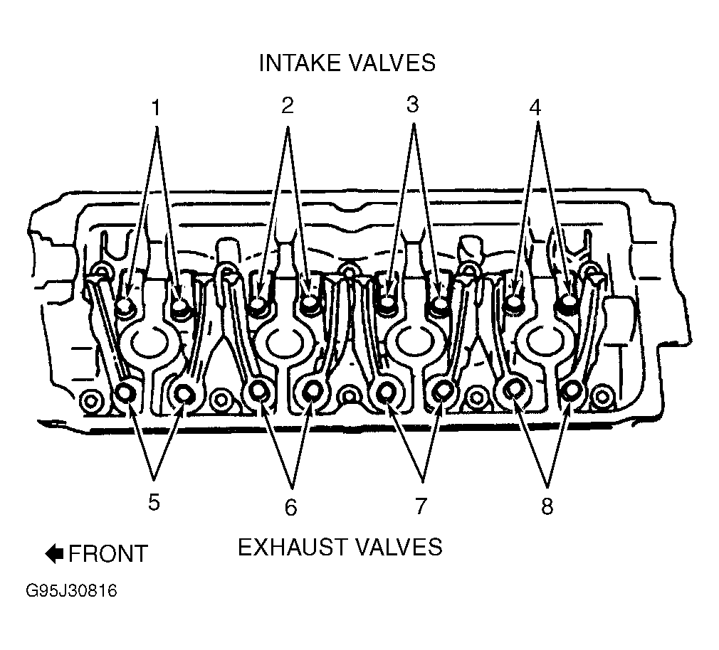 - Rotate crankshaft clockwise one revolution (360 degrees). Measure clearance between rocker arm adjusting screw and valve stem on valves No. 3, 4, 6 and 8. See Fig 3 . Adjust valve clearance if not within specification. See the VALVE CLEARANCE SPECIFICATIONS .