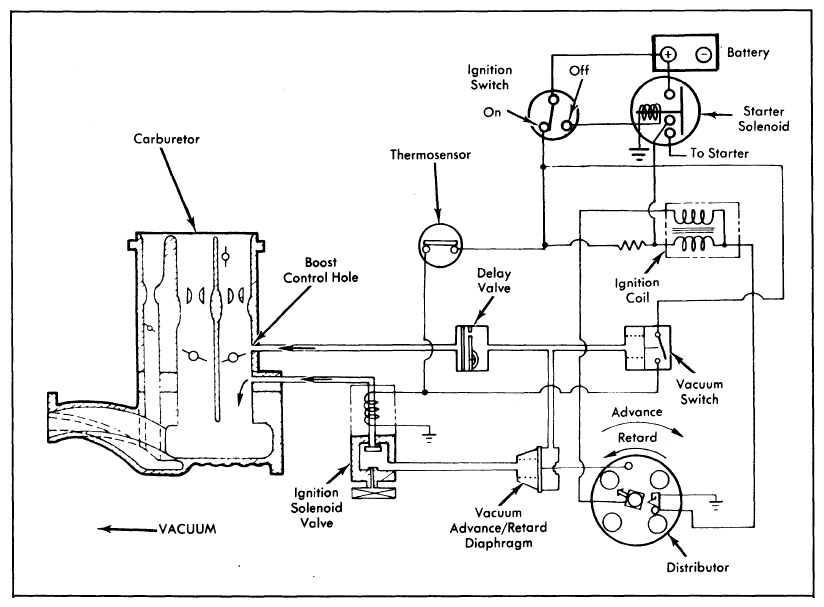 - Remove delay valve and replace with a "T" fitting. Connect vacuum gauge to "T" fitting. Start engine and raise RPM until vacuum gauge reads 7.5-8.7 in. Hg. If vacuum reading is low or there is no vacuum, check for plugged vacuum port at carburetor or vacuum leak at advance diaphragm or vacuum switch.