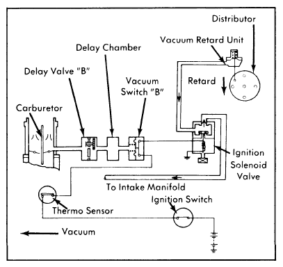 - With engine idling at normal operating temperature, there should be vacuum to distributor vacuum retard unit. If no vacuum is present, check for vacuum at ignition solenoid valve. If no vacuum is present at solenoid valve, clean intake manifold vacuum port.
