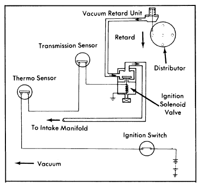 - With engine idling at normal operating temperature, there should be vacuum to distributor vacuum retard unit. If no vacuum is present, check for vacuum at ignition solenoid valve. If no vacuum is present at solenoid valve, clean intake manifold vacuum port.