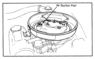 - If there is no vacuum, proceed to step 8). If vacuum is present check air suction line from air cleaner to exhaust manifold through air suction valve for leaks or disconnected hose. If suction line is okay, replace air suction valve and retest.