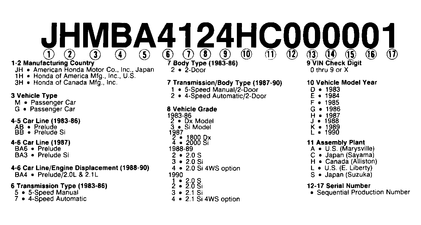 Home >> Honda >> 1985 >> Prelude Base, Automatic >> Repair and Diagnosis >> Engine Performance >> Application >> Engine/VIN Id >> Model Identification >> VIN Code Id Explanation