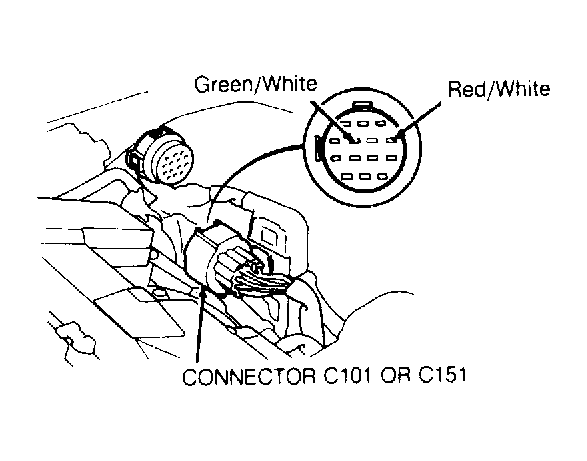2. IF light is on, warm engine to normal operating temperature (cooling fan on). Disconnect C101 (1.5L and standard) or C151 (HF and Si) connector from C210 connector. See Fig 1 . Measure resistance between Red/White wire terminal and Green/White wire terminal of C101 or C151 connector, on sensor side of harness. If resistance value is not 200-400 ohms, inspect for short or open in Red/White or Green/White wire between connector and coolant sensor. If wires are okay, replace coolant sensor.