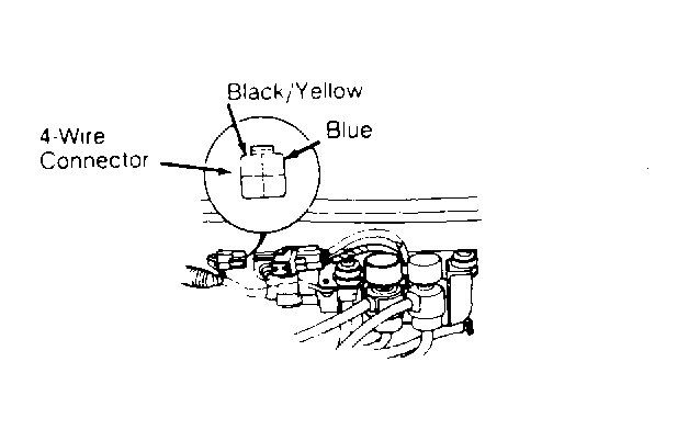 2. If vacuum is present, disconnect No. 22 hose from dashpot diaphragm and connect a vacuum gauge to hose. With engine coolant temperature less than 14°F (-10°C) and fast idle speed less than 1800 RPM, check for vacuum. If vacuum is not present, go to step 5). If vacuum is present, disconnect 4-wire dashpot control solenoid connector. See Fig 1 . Measure voltage between Black/Yellow (pos.) and Blue (neg.) wire terminals. If battery voltage is present, replace solenoid.