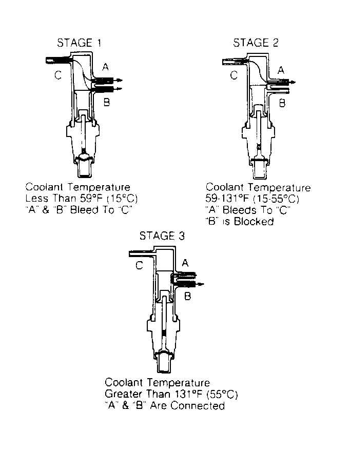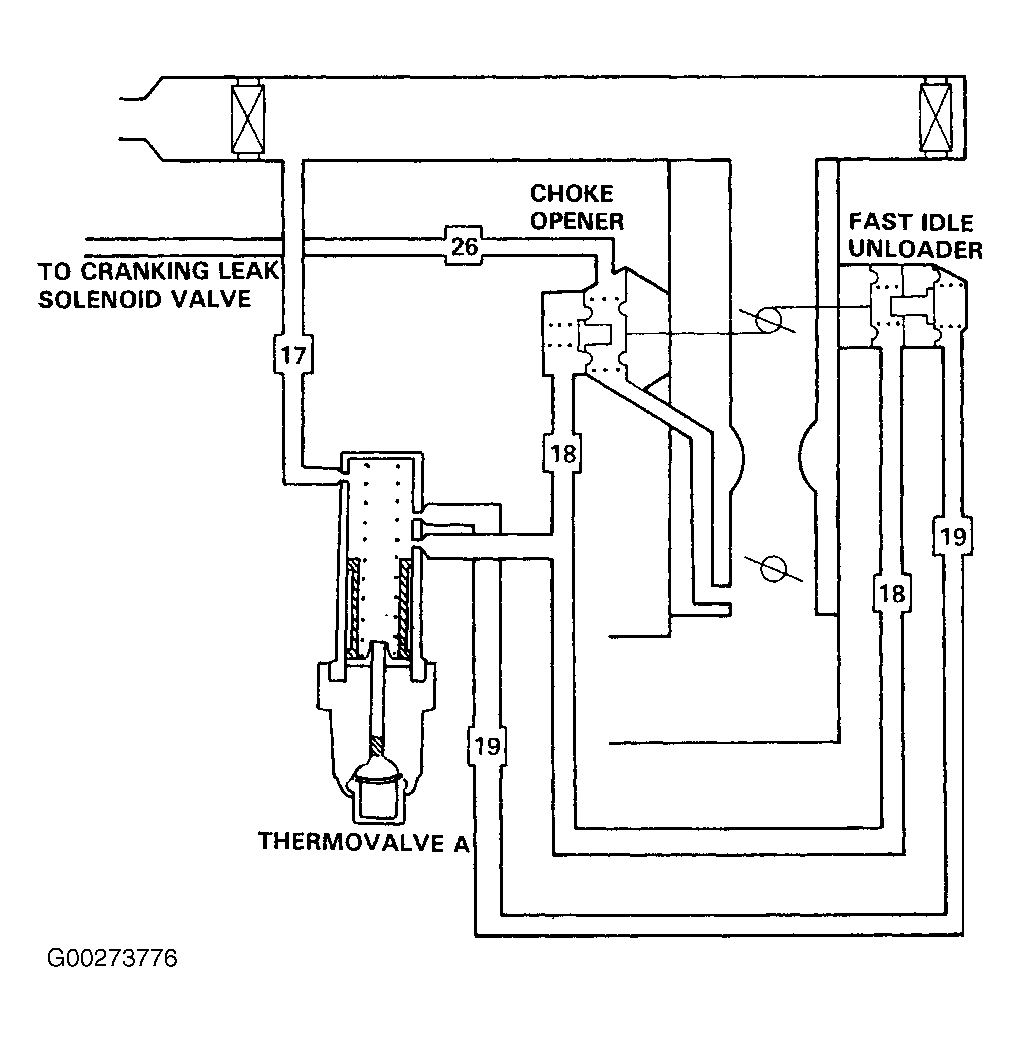 When engine coolant temperature is less than 59°F (15°C), wax thermovalve is open, allowing manifold vacuum to bleed off from outer choke diaphragm chamber into air cleaner. See Fig 1 and Fig 2 . This causes internal choke opener diaphragm spring tension to force choke valve closed. As coolant temperature increases, amount of vacuum bled into air cleaner is reduced and choke valve is gradually opened.