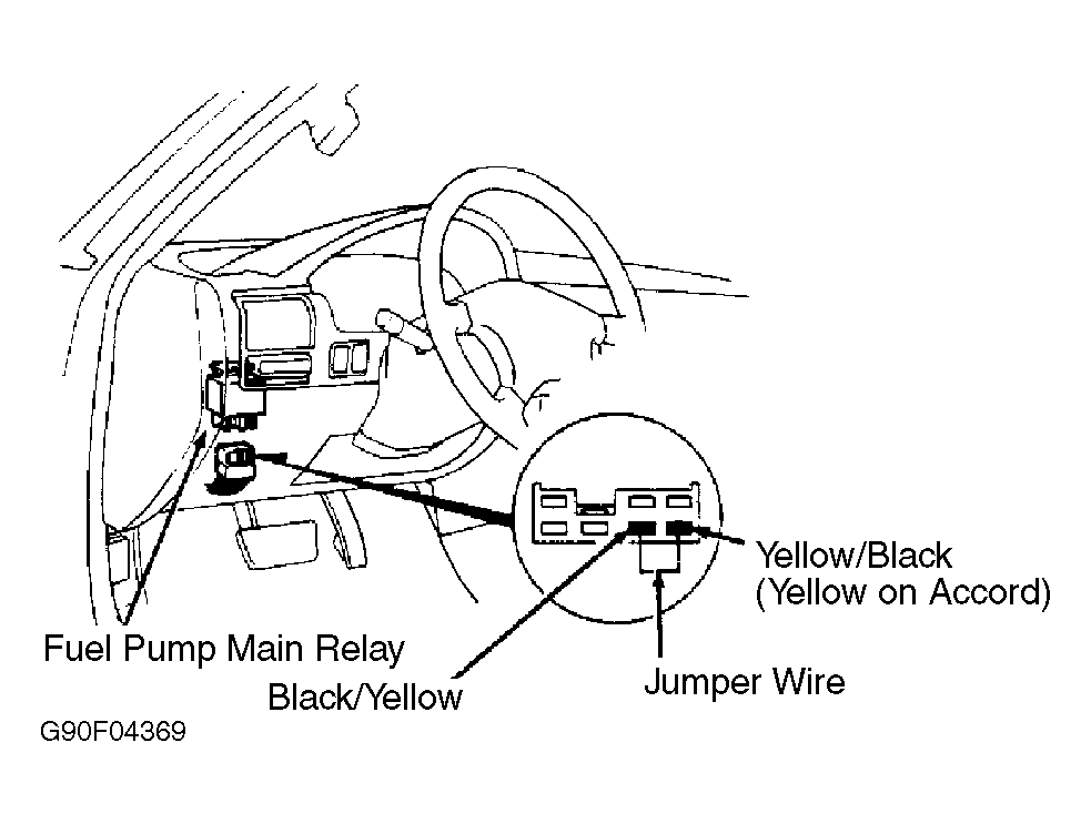 - Remove connector from fuel pump main relay. See Fig 1 . With a test light, check for battery voltage on Black/Yellow wire at fuel pump relay connector. If battery voltage is present, jumper Black/Yellow (positive) and Yellow (ground). If fuel pump runs, proceed to step 3). If fuel pump fails to run, see SYSTEM/COMPONENT TESTS - EFI article. If no voltage is present on the Black/Yellow wire, check for open in wire between fuel pump main relay connector and No. 2 fuse on fuse box. Proceed to step 3) after repairing circuit.