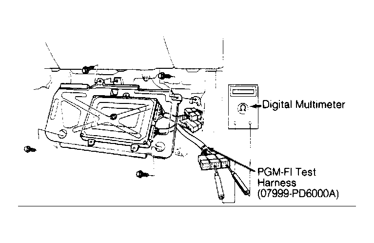 7. Turn ignition off. Reconnect O2 sensor connector. Attach ECU Test Harness (07999-PD6000A ) between ECU and ECU connector. See Figure . Connect voltmeter between ECU terminals A18 (-) and C16 (+). See Figure . Restart and warm engine to normal operating temperature. Hold engine speed at 4000 RPM for 10 seconds, and then close throttle completely.