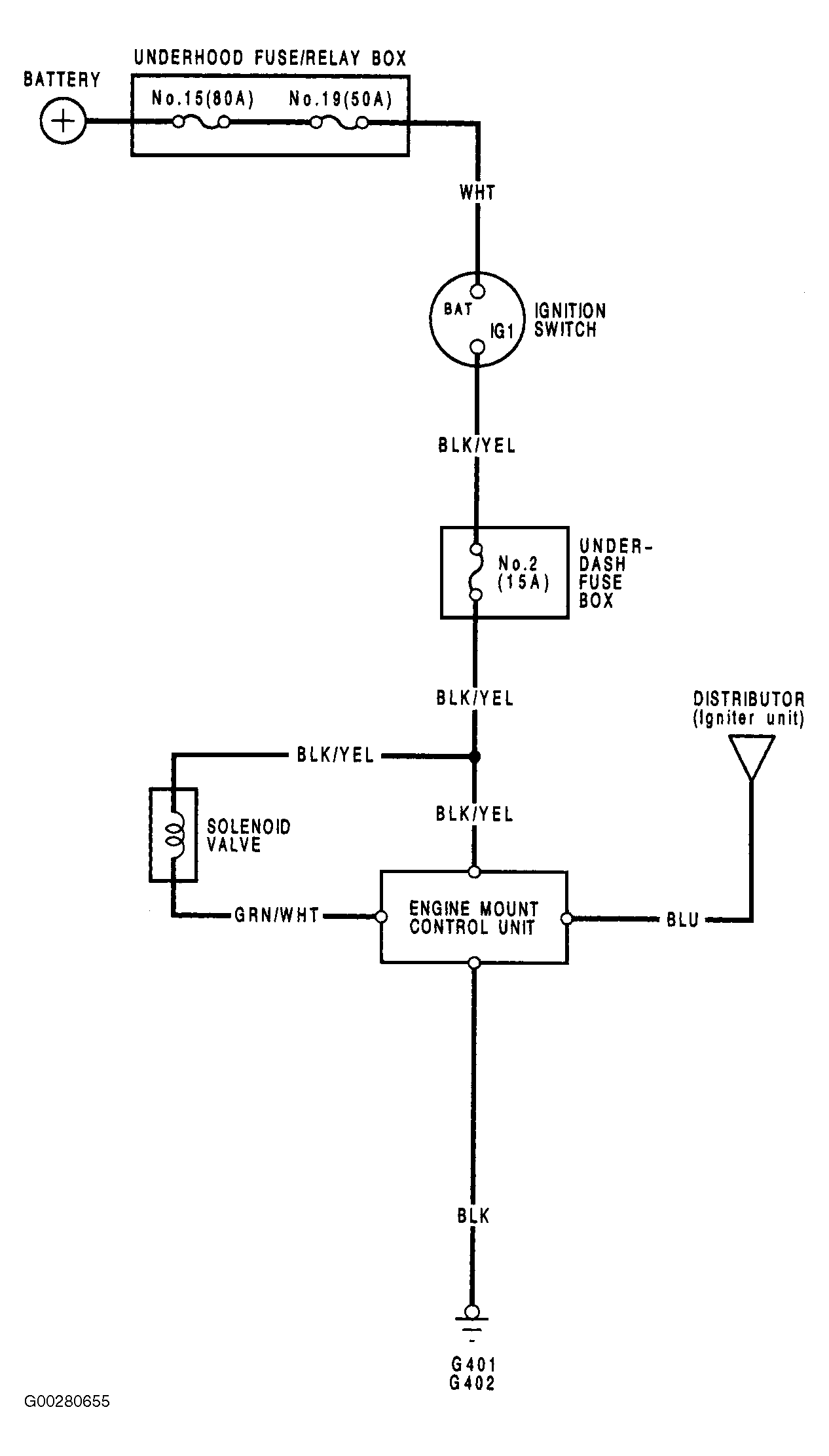 GRN/WHT (2) Check for voltage to ground: There should be battery voltage. Faulty solenoid valve. An open or short in the wire.