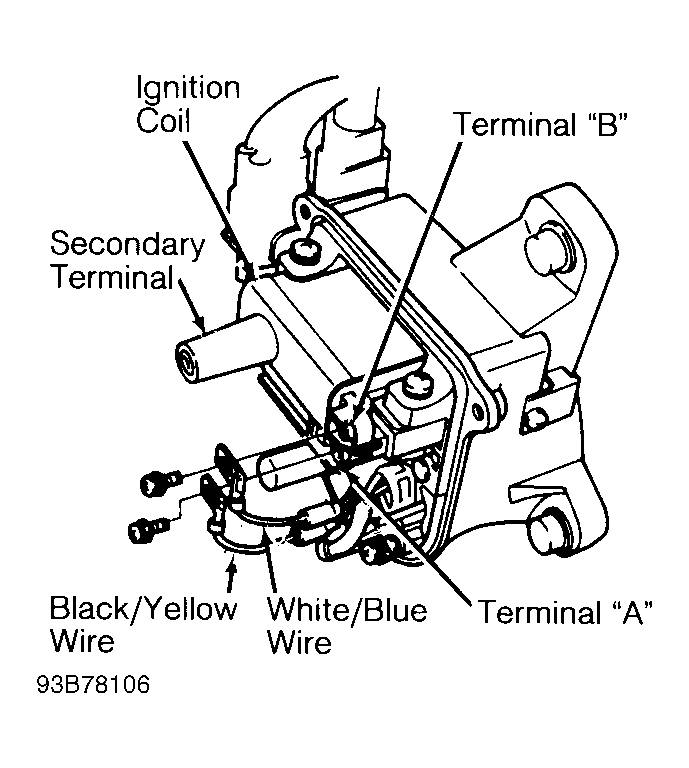 - Turn ignition off. Remove distributor cap. Remove 2 Phillips screws retaining primary ignition leads to ignition coil. Remove primary leads from ignition coil. Using an ohmmeter, check resistance between primary terminals "A" and "B" on ignition coil. See Fig 1 . Resistance should be .6-.8 ohm at room temperature.